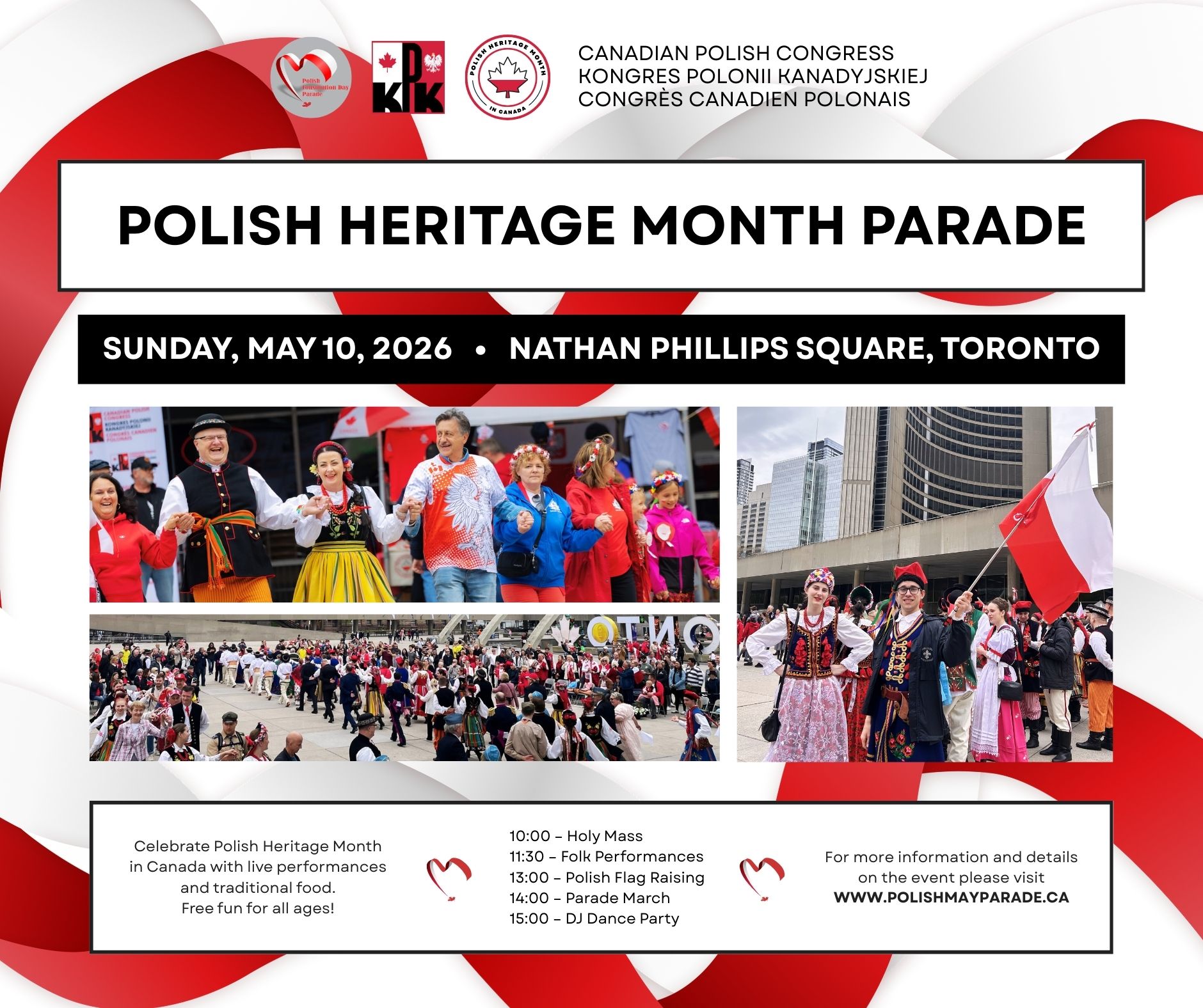 The Polish Heritage Month Parade will take place on Sunday, May 10, 2026, at Nathan Phillips Square in Toronto. Celebrate Polish Heritage Month in Canada with live performances and traditional food – free fun for all ages! The day begins at 10:00 with Holy Mass, followed by Folk Performances at 11:30, Polish Flag Raising at 13:00, the Parade March at 14:00, and a DJ Dance Party at 15:00.