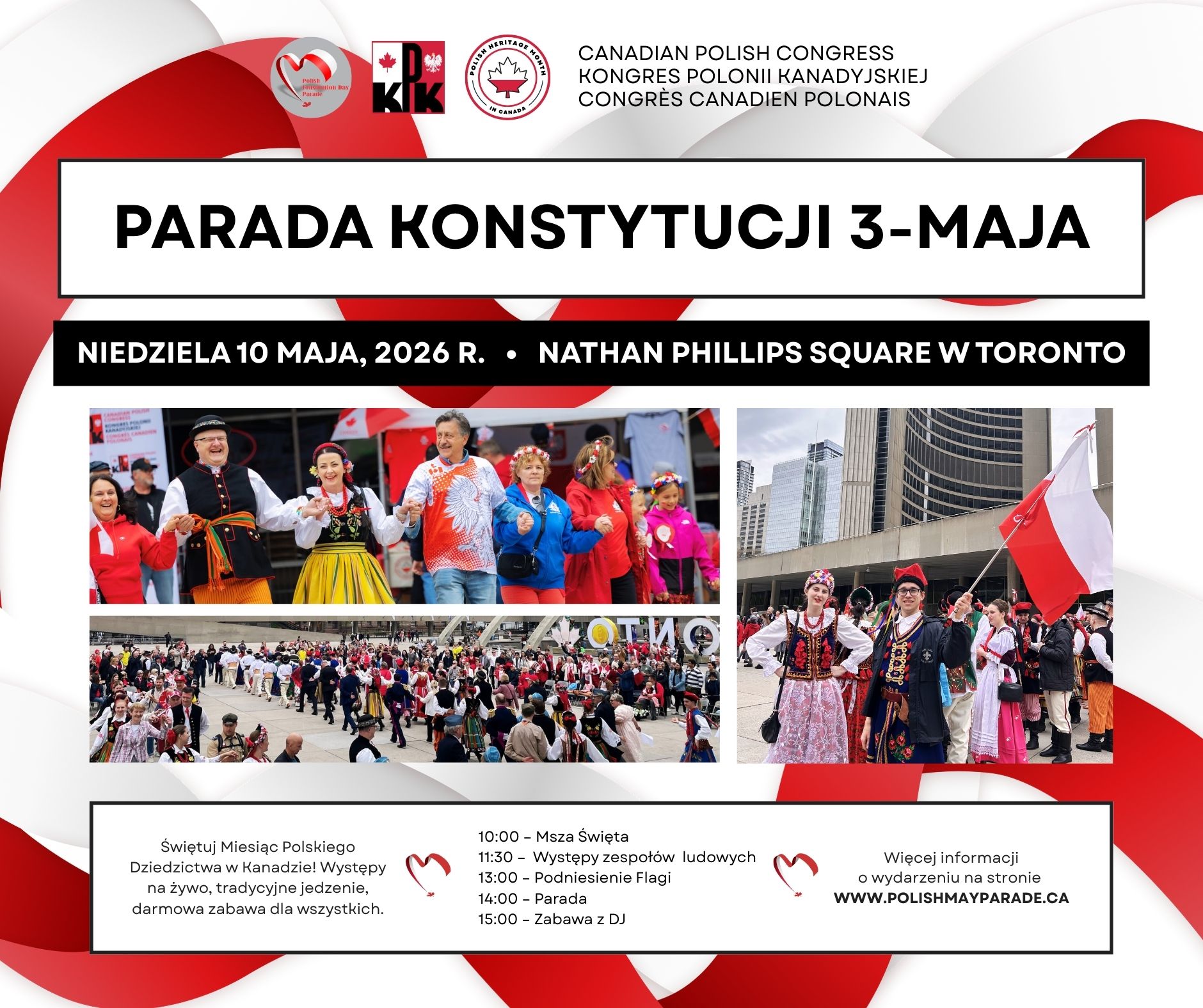 Parada Konstytucji 3 Maja odbędzie się w niedzielę, 10 maja 2026 r., na Nathan Phillips Square w Toronto. Świętuj z nami Miesiąc Dziedzictwa Polskiego w Kanadzie! Czeka na Was wiele atrakcji: występy zespołów ludowych na żywo, tradycyjne polskie jedzenie oraz darmowa zabawa dla wszystkich. Dzień rozpocznie się o godzinie 10:00 Mszą Świętą w Parafii Św. St. Kostki. Następnie, o 11:30, zapraszamy na występy zespołów ludowych, a o godz. 13:00 odbędzie się ceremonia podniesienia flagi RP. O godz. 14:00 rozpocznie się Parada, a zaraz po niej zapraszamy na zabawę z DJ-em. Do zobaczenia!